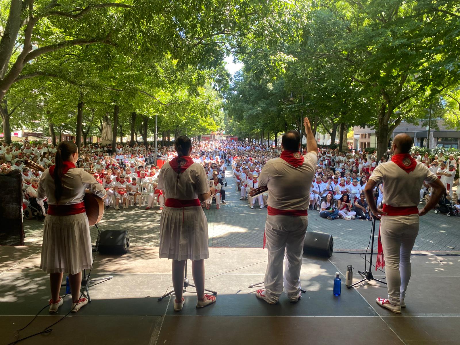No hay un solo espacio libre para ver al grupo Orgullo Navarro en el Paseo Sarasate. Este escenario recoge a mediodía durante todas las fiestas el ciclo “Suena a Jota”.